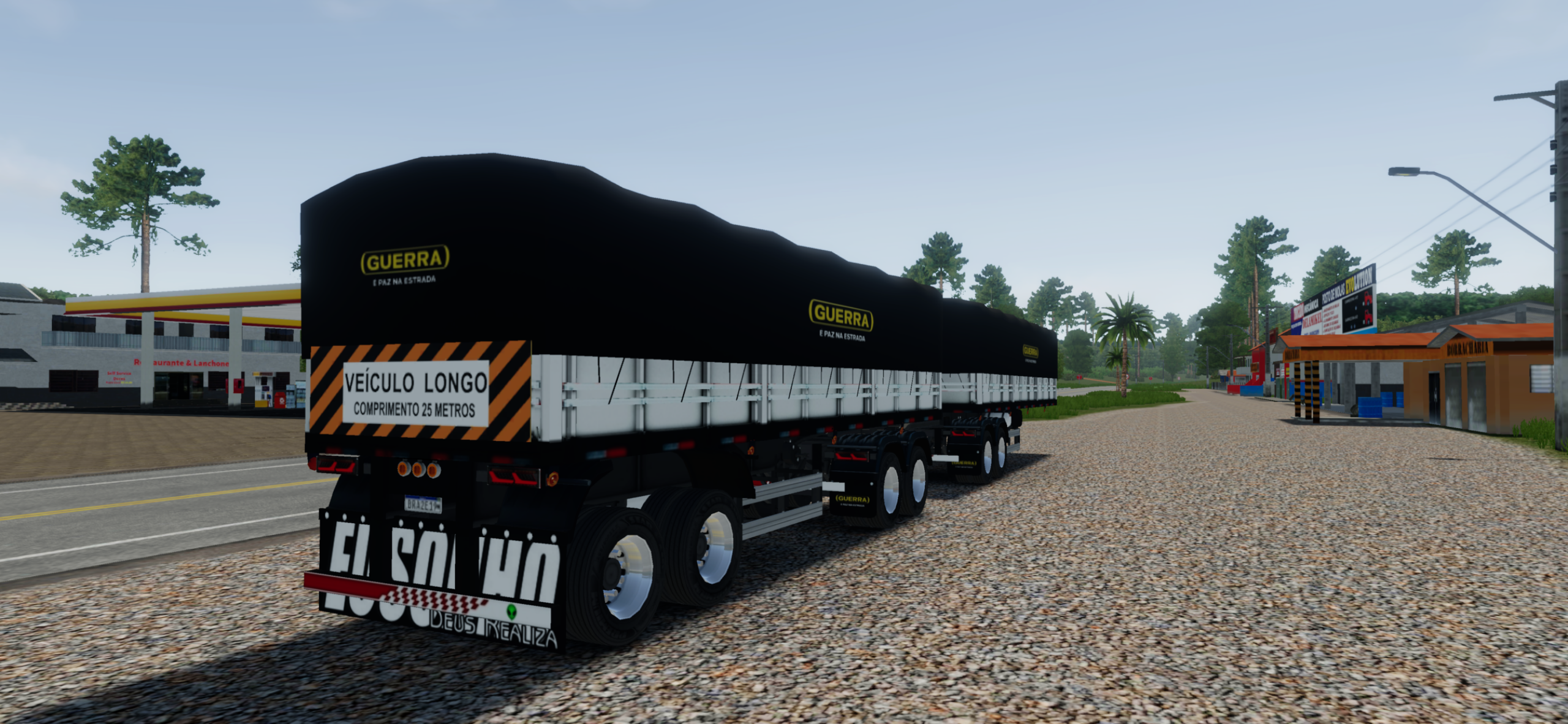Em movimento, o RodoTrem graneleiro Branco @Higor mantém uma silhueta marcante nas rodovias do jogo. O alinhamento dos eixos e o comprimento do conjunto criam um visual imponente, facilmente reconhecido entre outros caminhões no servidor.